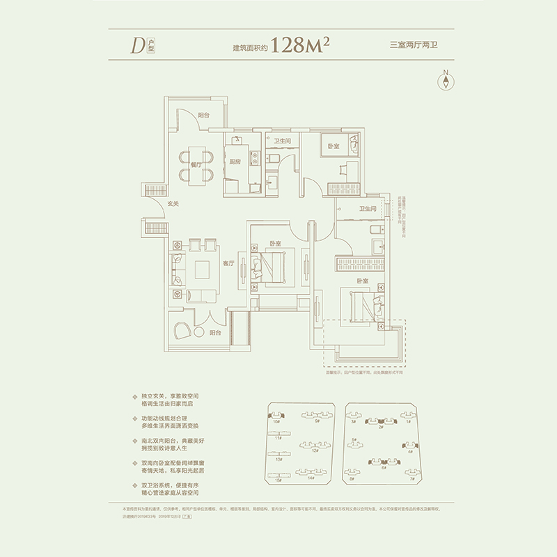 布局】1.室内过道面积少,可实现功能空间充分利用。2.餐厅与客厅相连,室内视野更开阔。,【功能空间配置】1.有晾晒衣物的阳台。